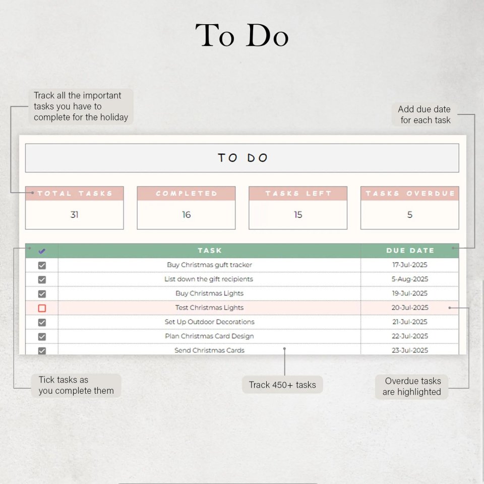 Stay organized this holiday season with our Christmas Gifts Tracker Spreadsheet. This editable Google Sheets template helps you plan, track, and budget for all your holiday gifts, including cards list and keeps a track of your to do list for the holiday. Perfect for managing your gift list with ease, it’s an essential tool for stress-free holiday planning.