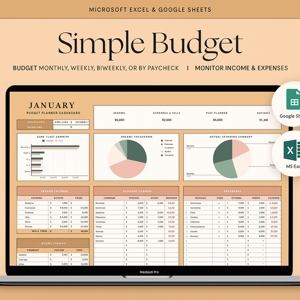 Start being mindful of your spending and begin your personal finance journey with this Simple Budget Spreadsheet. It includes only what you need — designed to be simple, easy to understand, and visually appealing. All you have to do is enter your transactions, and everything else will be calculated automatically!