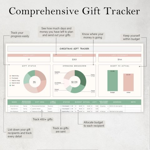 Make your holiday season stress-free and perfectly organized with this Christmas Gift Tracker Spreadsheet. Designed for Google Sheets, this planner helps you manage your Christmas gift list, track budgets, monitor spending, and organize holiday cards—all in one easy-to-use template.