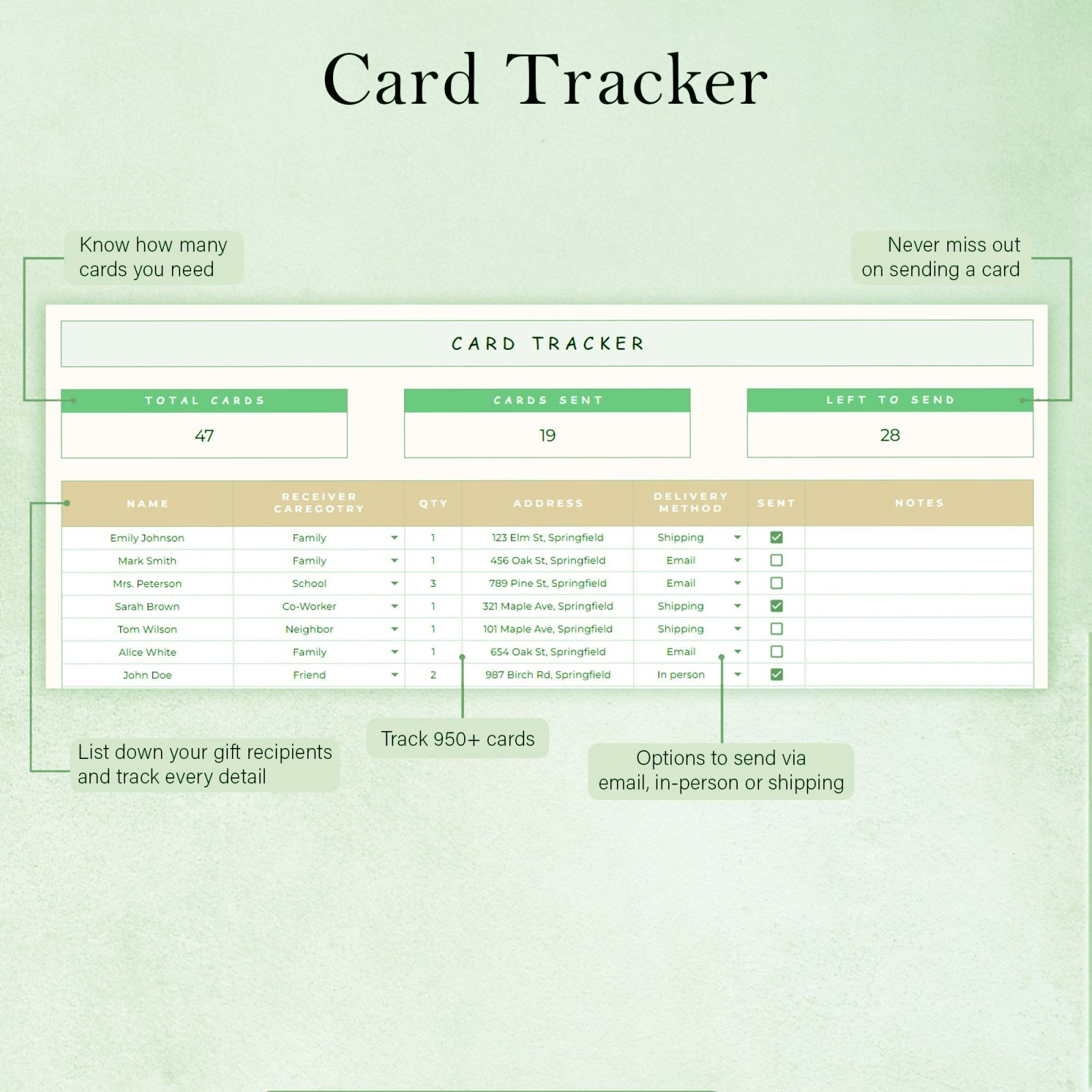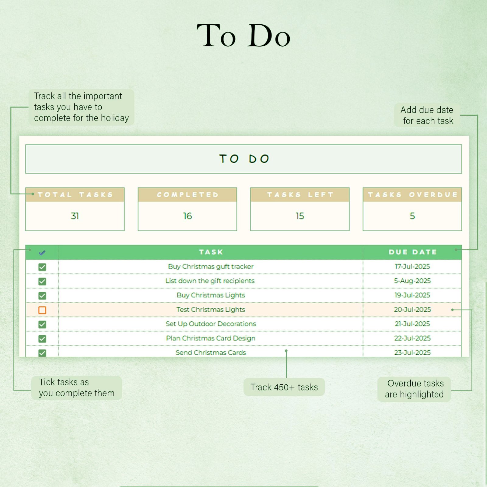 Stay organized this holiday season with our Christmas Gifts Tracker Spreadsheet. This editable Google Sheets template helps you plan, track, and budget for all your holiday gifts, including cards list and keeps a track of your to do list for the holiday. Perfect for managing your gift list with ease, it’s an essential tool for stress-free holiday planning.