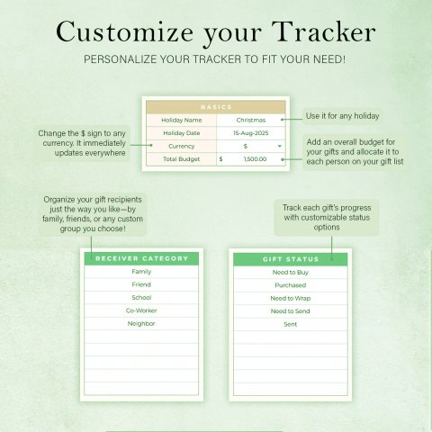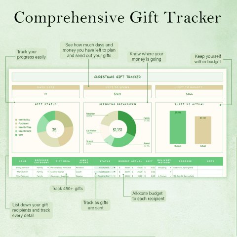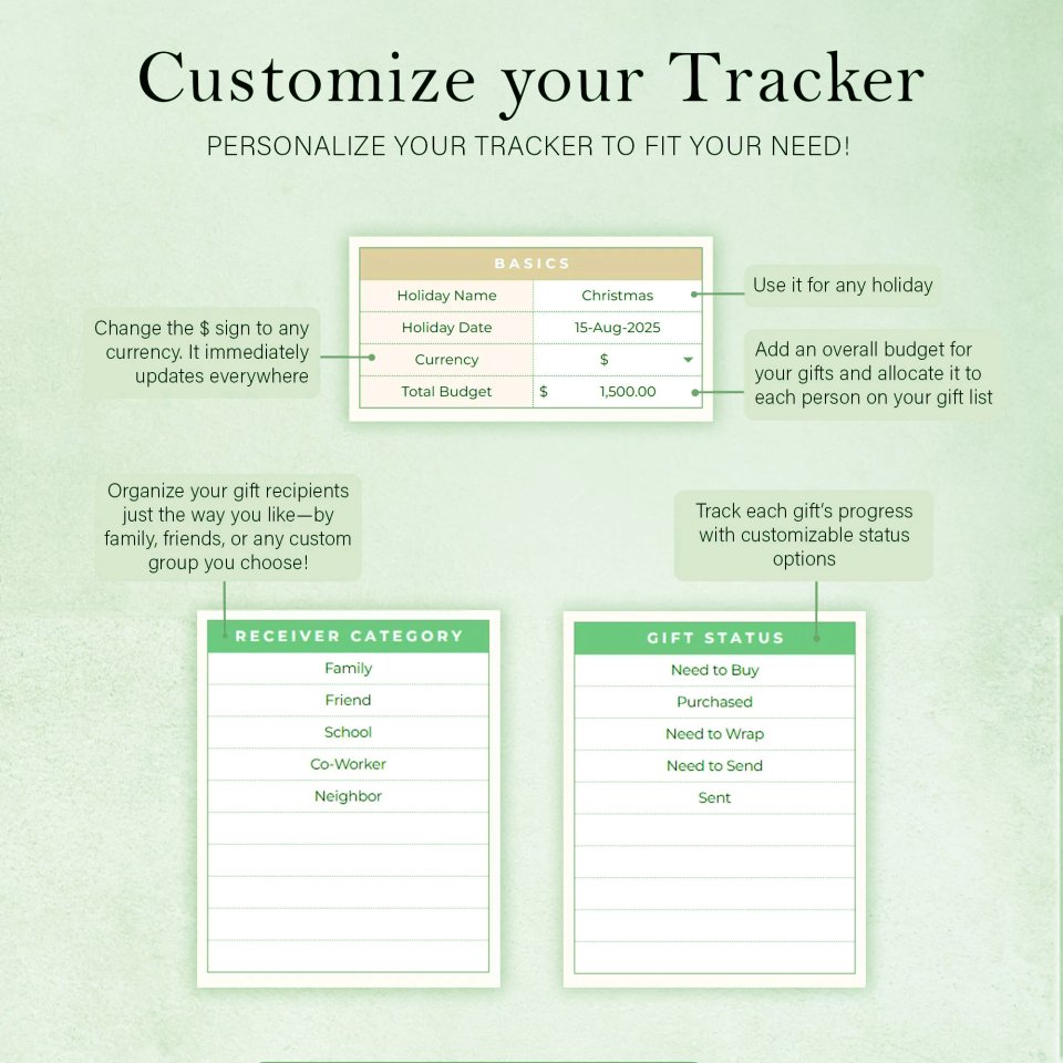 ✓ Gift tracker: Categorize recipients by your choice, customize the status and track each gift