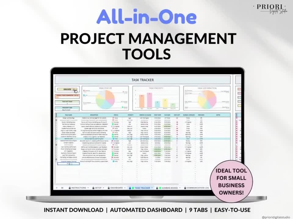 With this spreadsheet, you can track tasks using a Kanban Board, manage timelines with a Gantt Chart, set budgets, and access a detailed project overview – all in one tool.