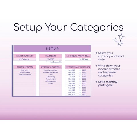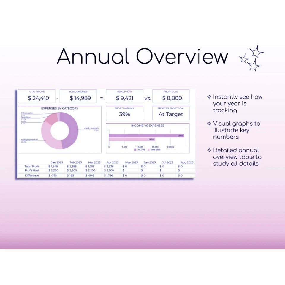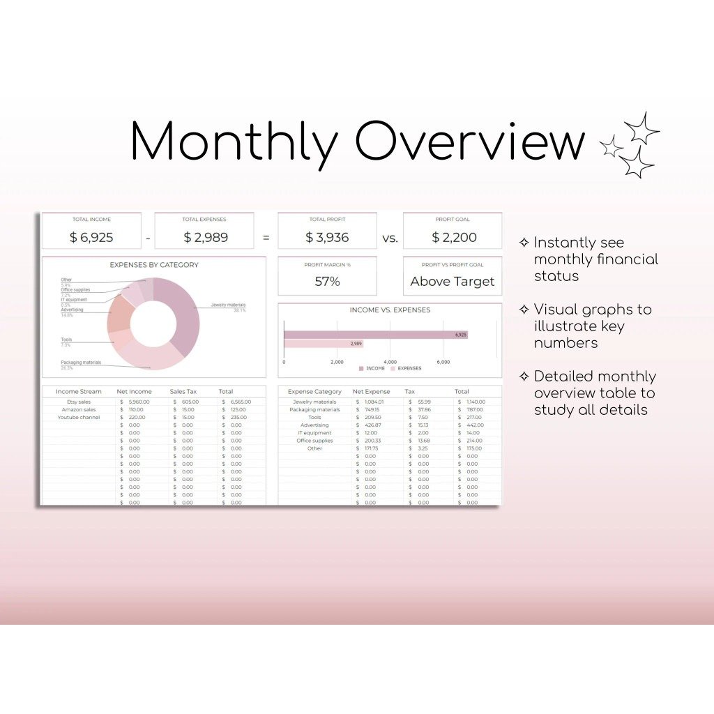 Simply enter your income and expense data, and all calculations and summaries will be automatically presented in the form of a Monthly Overview and Annual Overview.