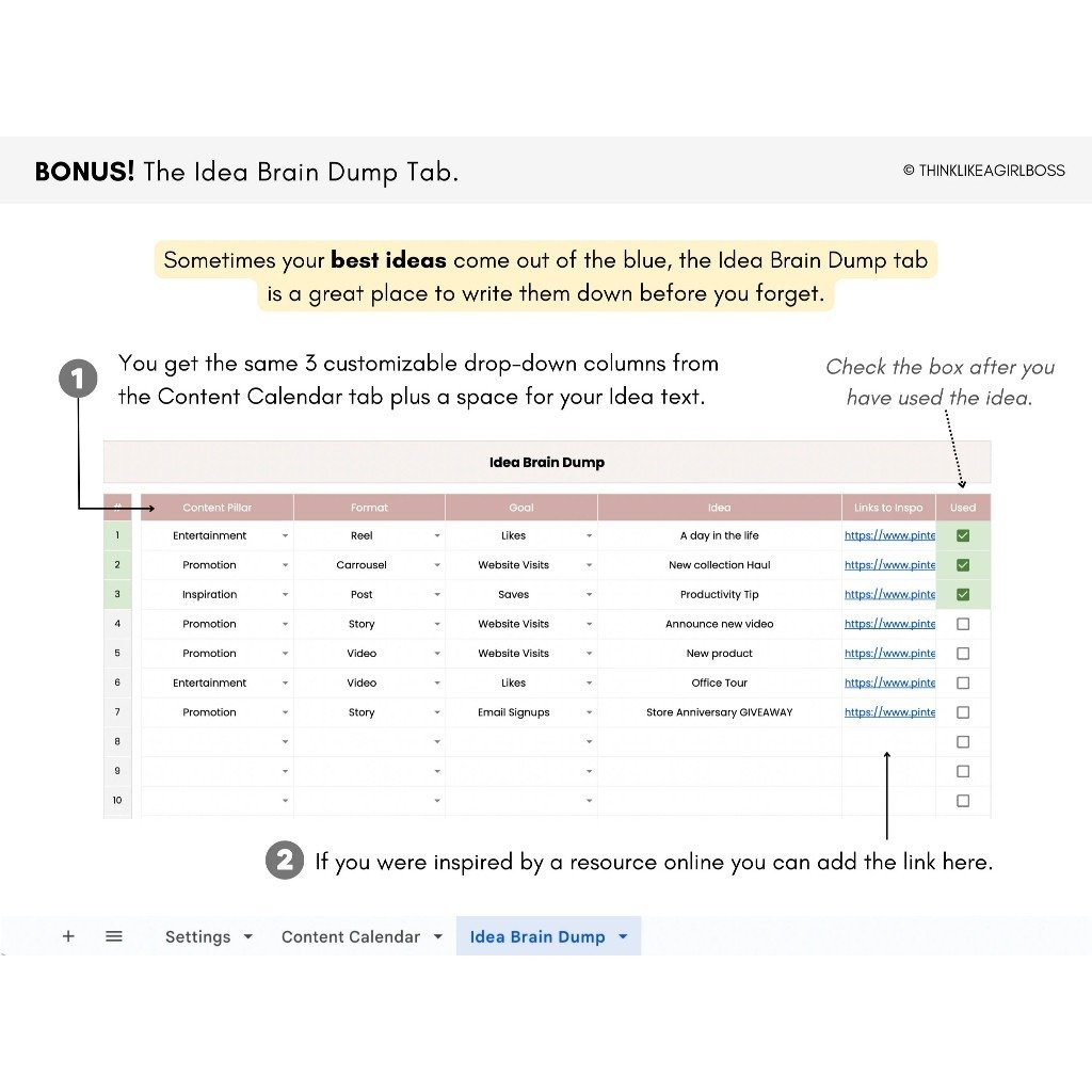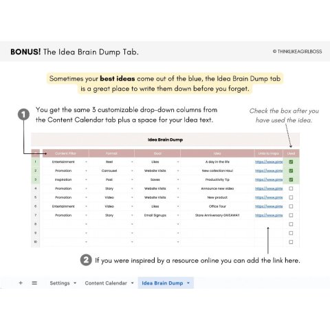 Bonus β Idea Brain Dump: A dedicated space to capture spontaneous content ideas so you can organize and use them later.