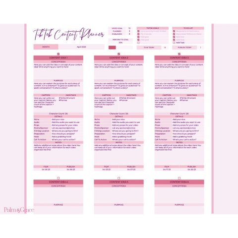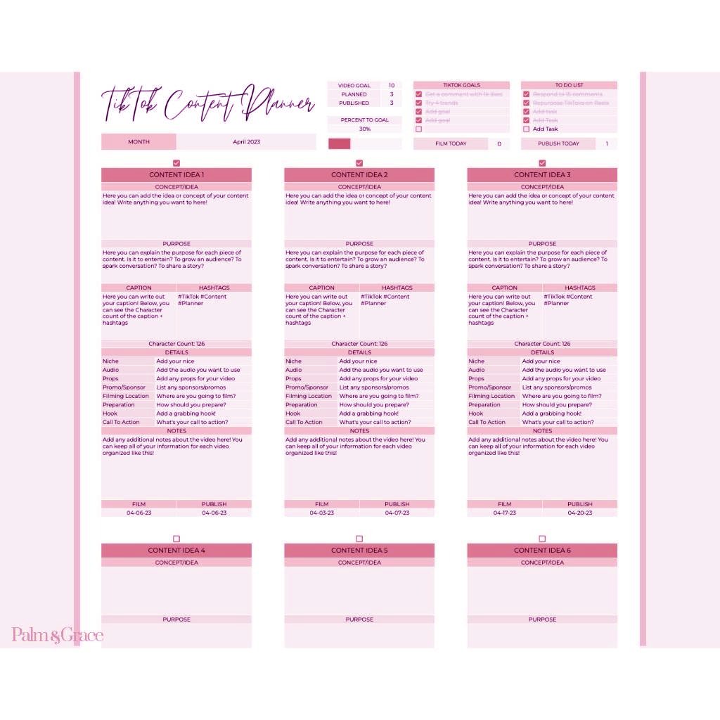 This TikTok Content Planner Google Sheets spreadsheet will help you easily plan social media content for TikTok. Use this social media content planner to map out your TikTok videos, jot down ideas, track your follower count, and more. This spreadsheet will help you see everything you need in one place, plus it's incredibly easy to use!