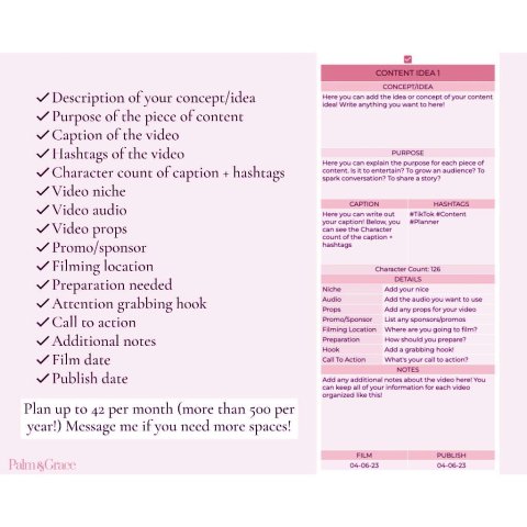 + Record information such as video concept, goal, description, hashtags, props, audio, call-to-action, and hook, and view automatic data such as the number of characters in the description and hashtags so you don't exceed the limit!