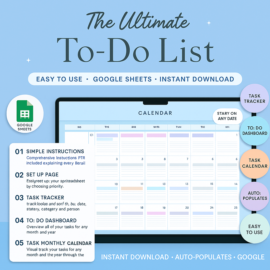 Stay organized and manage your tasks with ease using our To Do List Planner Spreadsheet designed for Google Sheets. This template allows you to track up to 100 tasks and sort them by priority, status, date, and category. The smart dashboard and automated task calendar update instantly, making the entire system simple, efficient, and user-friendly.