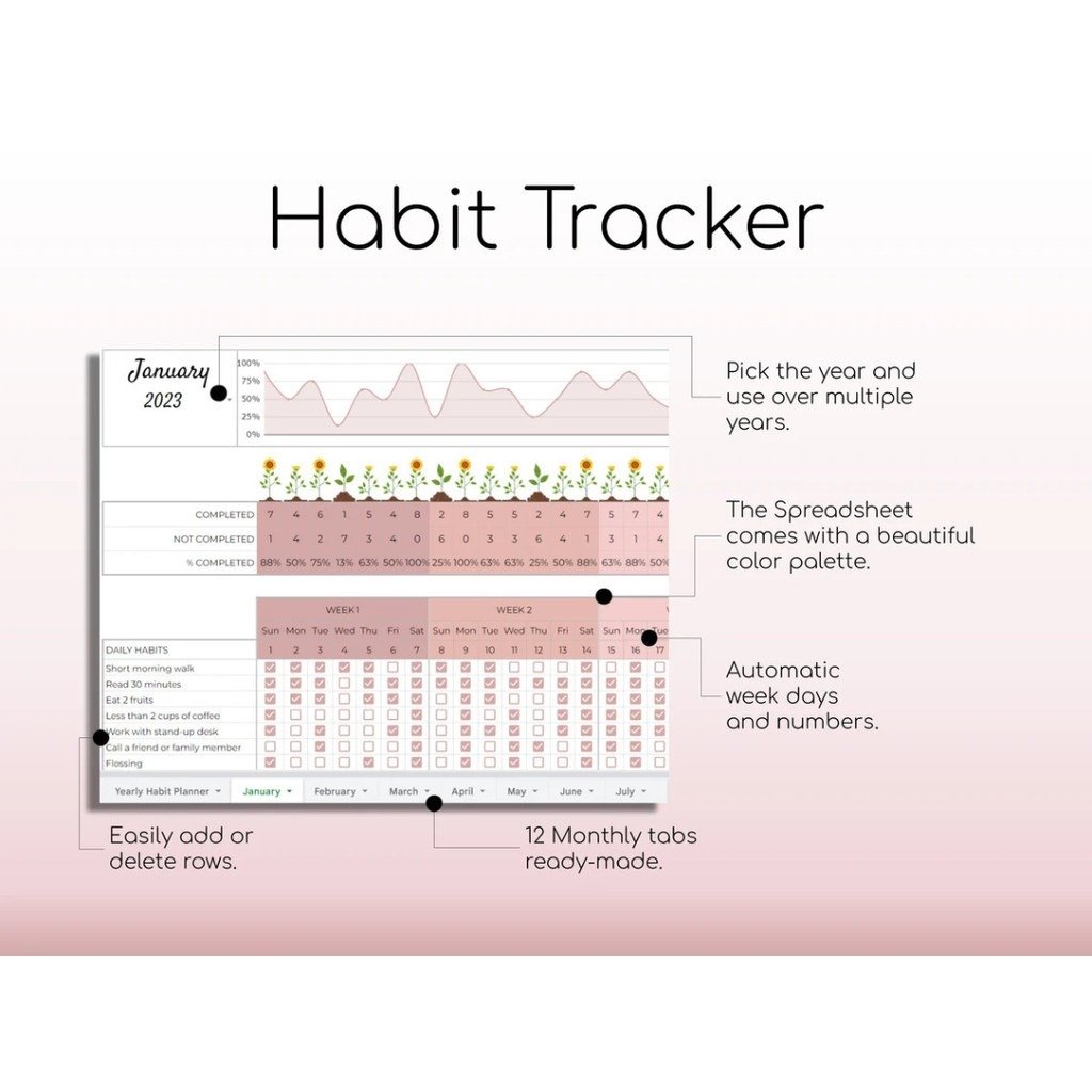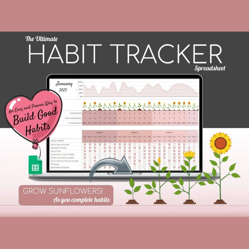 With this Habit Tracker Spreadsheet, every completed habit grows a sunflower β the more habits you check off, the more your digital garden blooms! Designed with a lovely pink aesthetic, this tracker turns your daily routine into a beautiful, motivating experience.