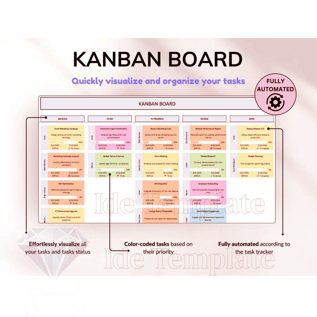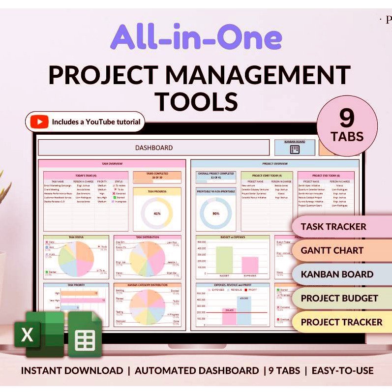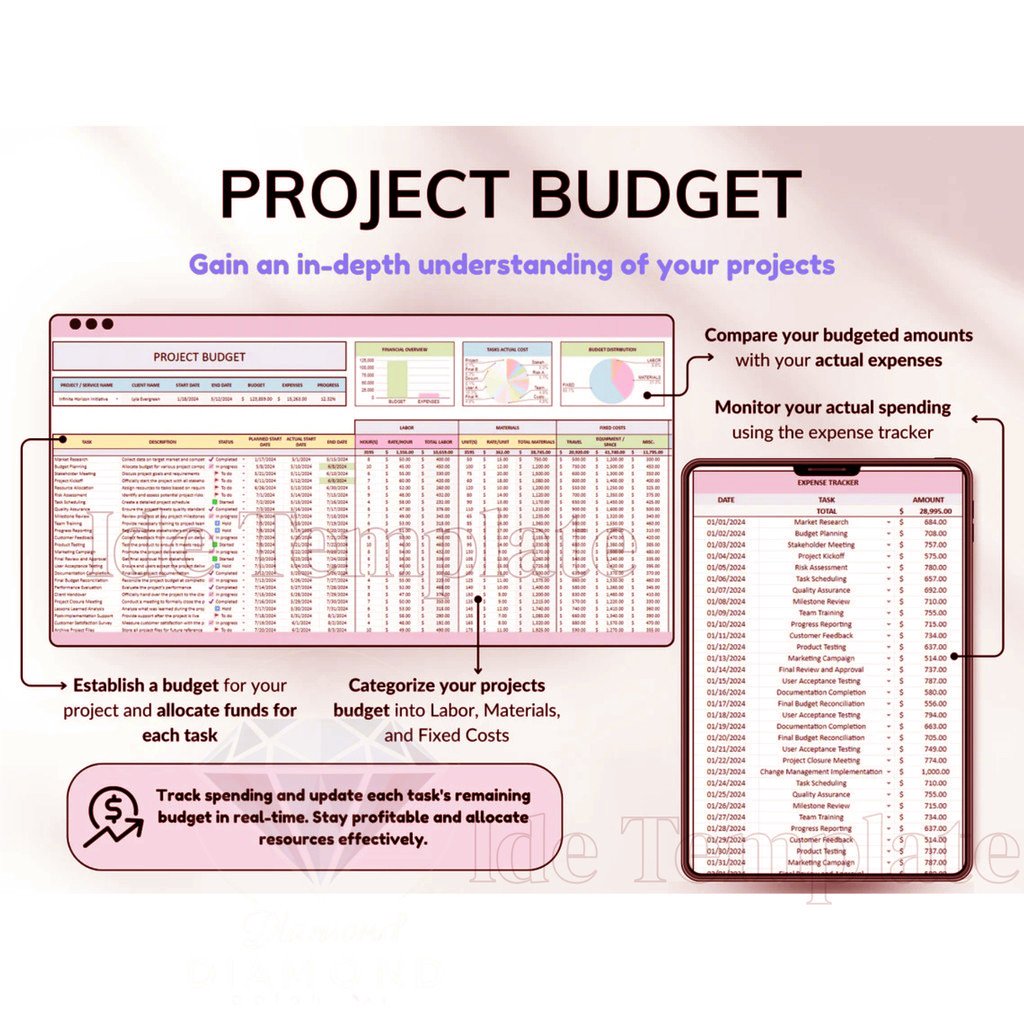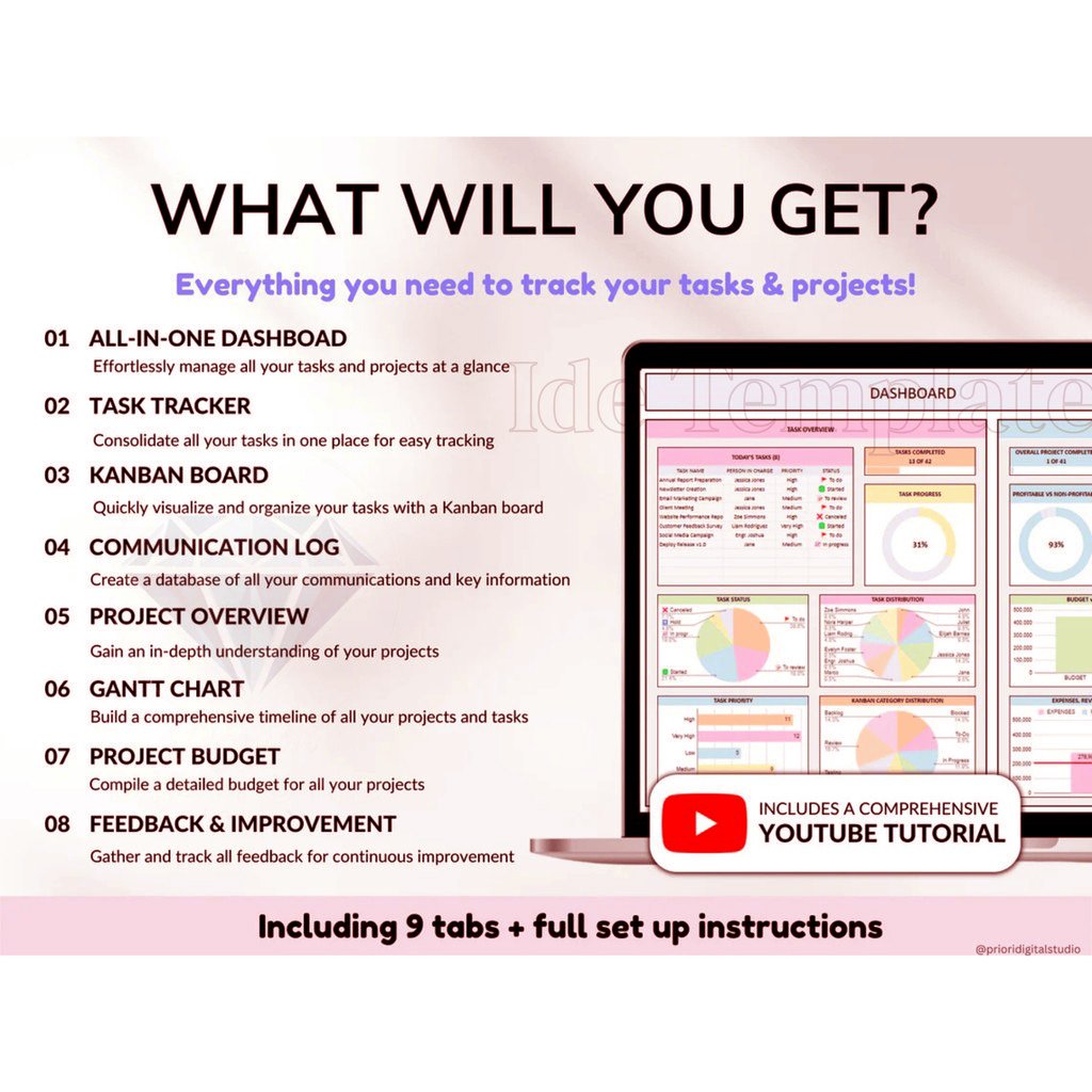 With this spreadsheet, you can track tasks using a Kanban Board, manage timelines using a Gantt Chart, set budgets, and access a detailed project overview – all in one tool.