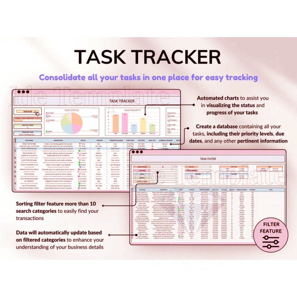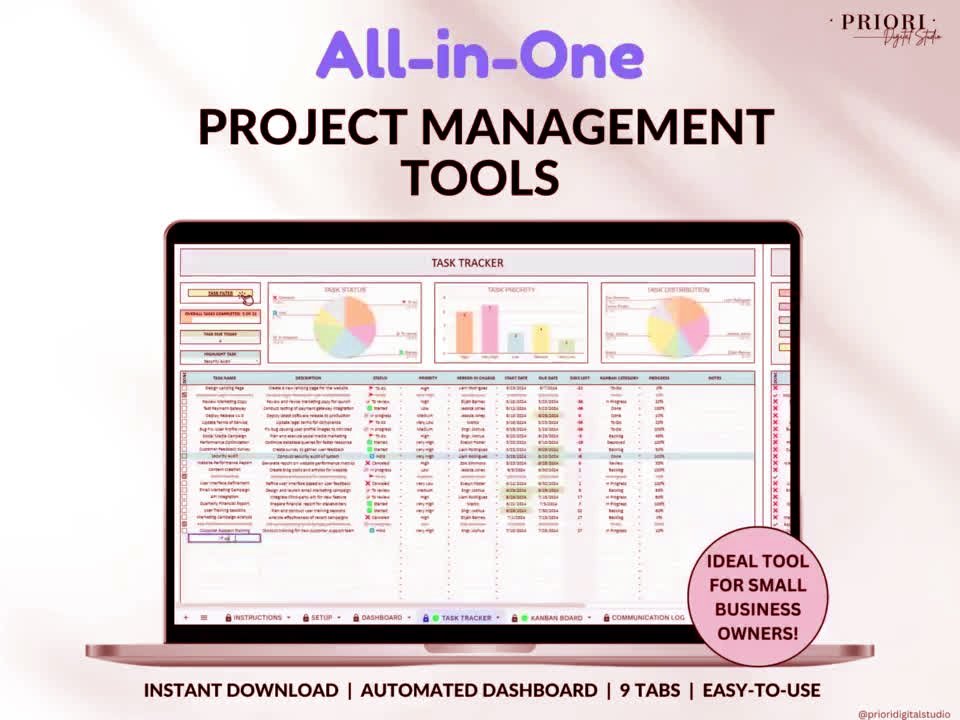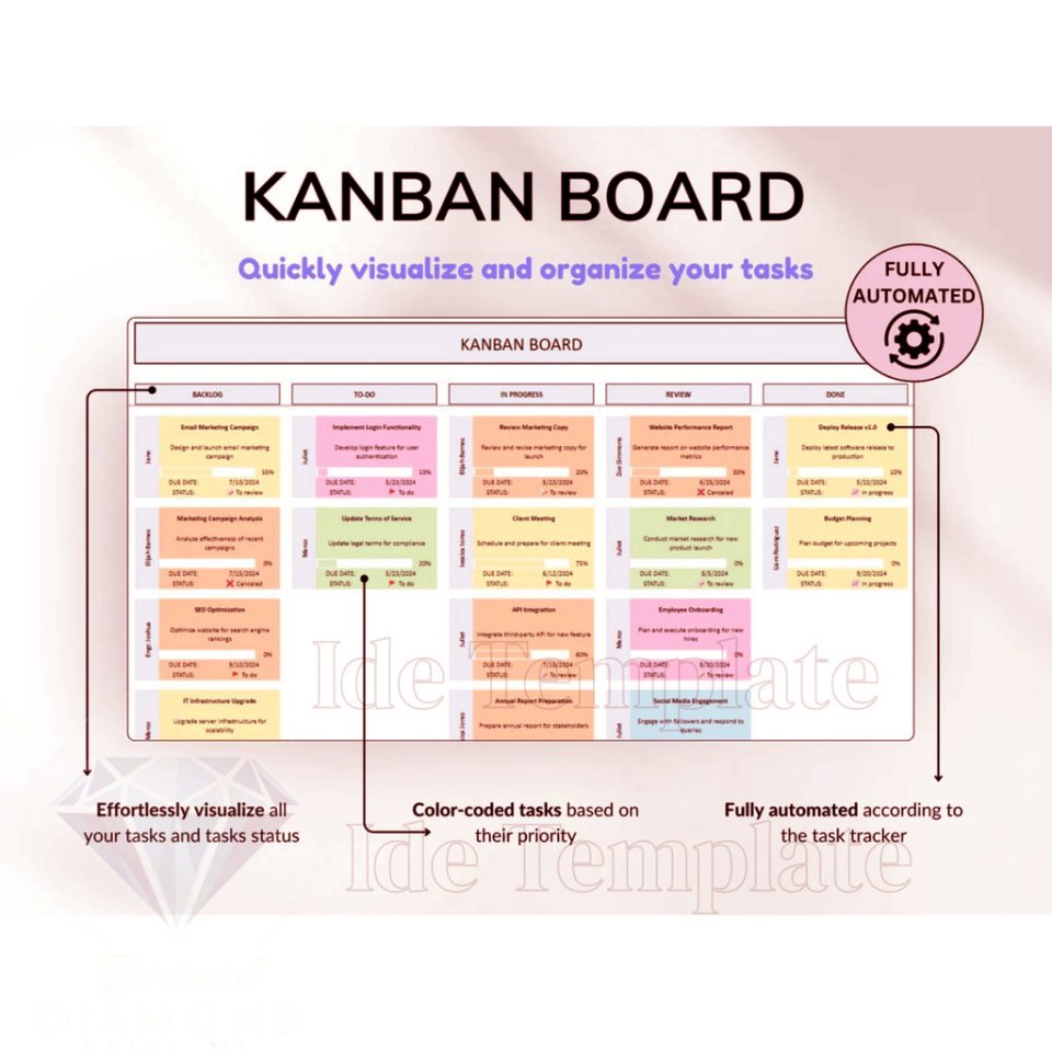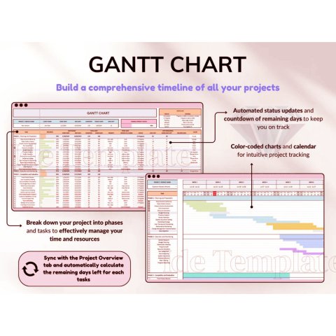 With this spreadsheet, you can track tasks using a Kanban Board, manage timelines using a Gantt Chart, set budgets, and access a detailed project overview – all in one tool.